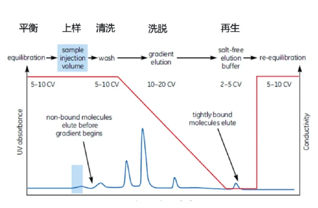 離子交換層析是基于蛋白質(zhì)和離子交換層析介質(zhì)之間的電荷相互作用進行分離。離子交換層析介質(zhì)通常帶有正或負電荷,吸附帶有相反電荷的蛋白質(zhì)。通過調(diào)整緩沖液的離子濃度或pH值,可以改變蛋白質(zhì)與介質(zhì)的結(jié)合強度,實現(xiàn)不同蛋白質(zhì)的分離。